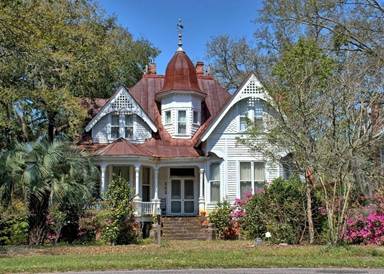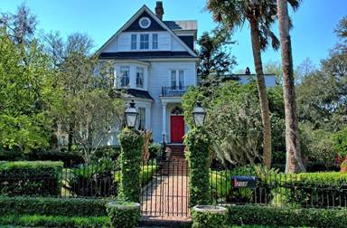 Summerville Historic Home #18 on the Walking Tour is the Samuel Lord / Elizabeth Arden House at 208 Sumter Avenue. This handsome Victorian house built for Samuel Lord by the same contractor who built the Old Pine Forest Inn. It is three stories tall with double piazzas, it is more representative of Charleston homes. The home was purchased by Elizabeth Arden, cosmetic firm executive, in 1938 as a winter residence, and remained in her possession until 1954. Current owners have kept the famous red door.